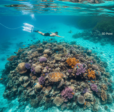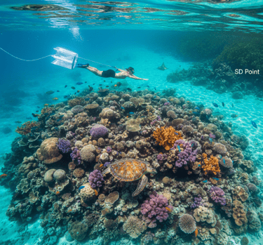 Moving on to SD Point, this location presents a different but equally captivating snorkeling experience. Here, the crystal-clear waters are teeming with diverse marine life, from vibrant schools of fish to the occasional glimpse of larger species like rays and reef sharks. With clarity reaching several meters, SD Point is perfect for spotting intricate details of fish behavior and the colorful marine landscape.